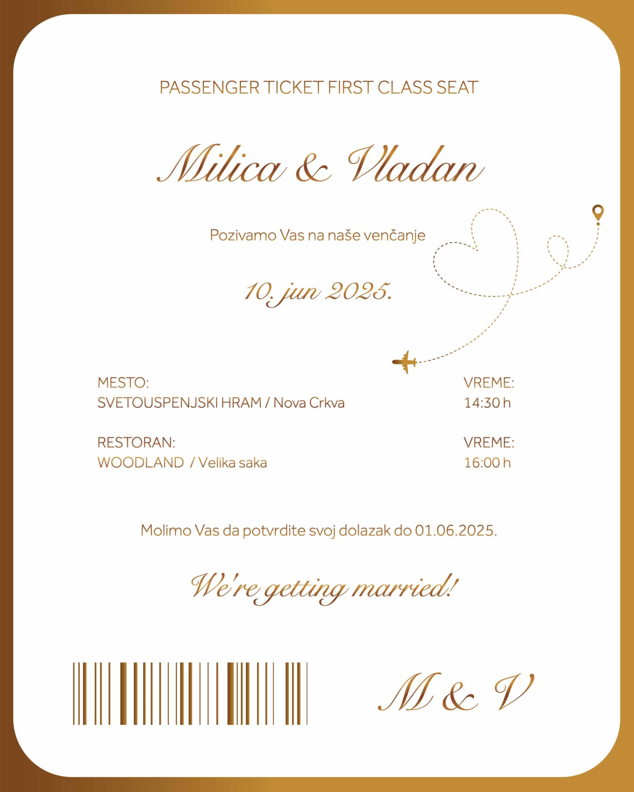 Pozivnice koje podsećaju na avionsku kartu, pa otuda ime ‘Put do ljubavi’. Da brak bude sigurna destinacija i da se na tom putu zajedno uživa i raste. Najpre su kreirane u istom fontu kao pravi boarding pass, međutim najviše mladenaca je izabralo ovaj font. Poslušani su rezultati ankete i ovo je finalni rezultat. Ceo vizual je u zlatotisku.