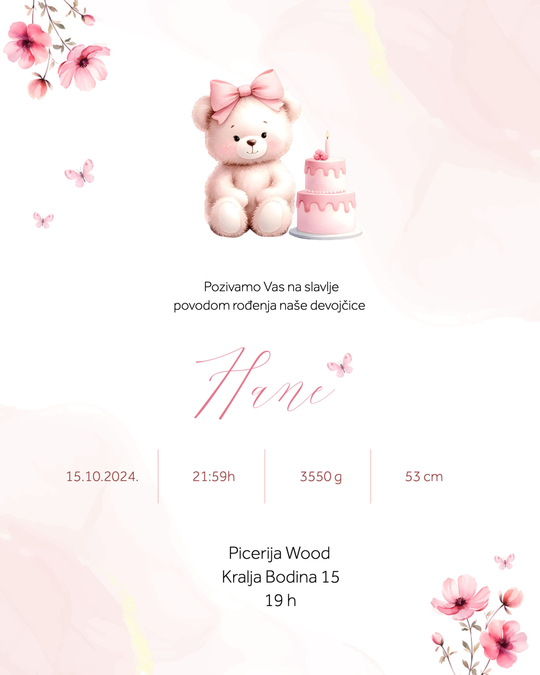 Najlepše vesti su kad se rodi novi život i to se treba proslaviti, uvek. Ovom pozivnicom pozovite na slavlje, ukucajte datum, satnicu, težinu i dužinu. Nek ostane za uspomenu zauvek, a i iz ličnog iskustva, te iste informacije će značiti nekome jednog dana kao podsetnik 🙂
