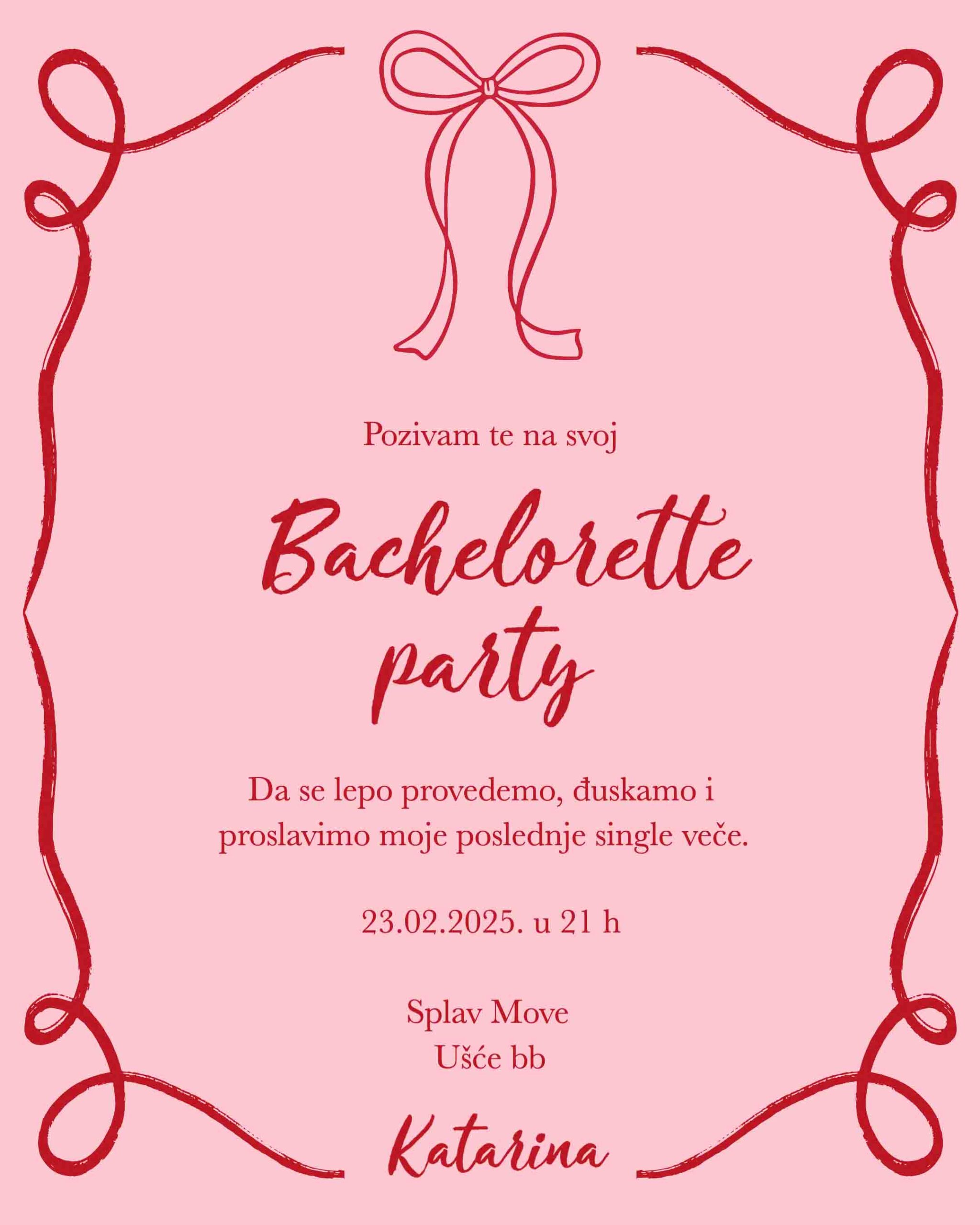 Moderna pozivnica za devojačko veče. Ovakve pozivnice su među popularnijima poslednjih sezona. Kombinacija crveno roze, valoviti obod i handwritten font.